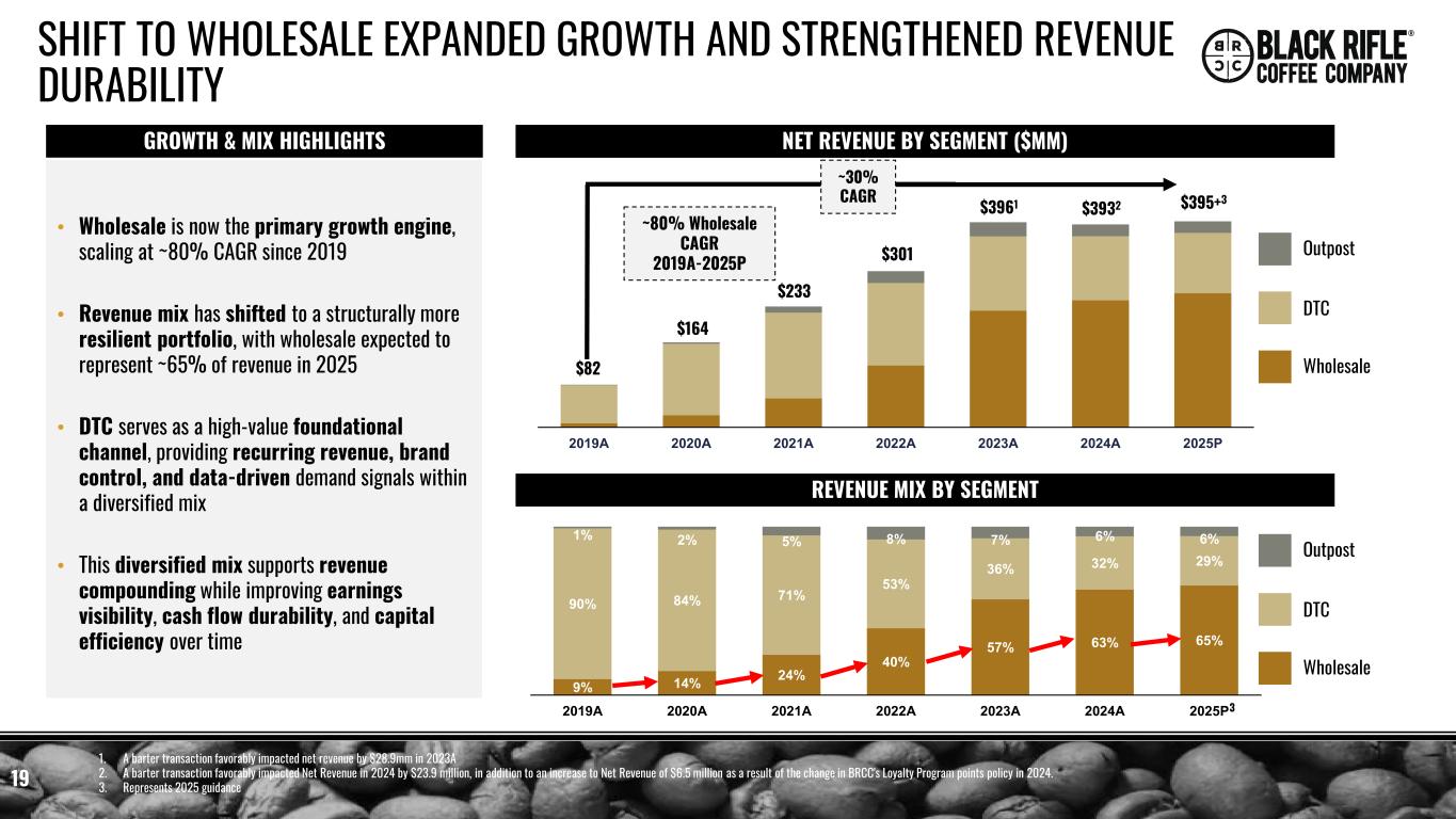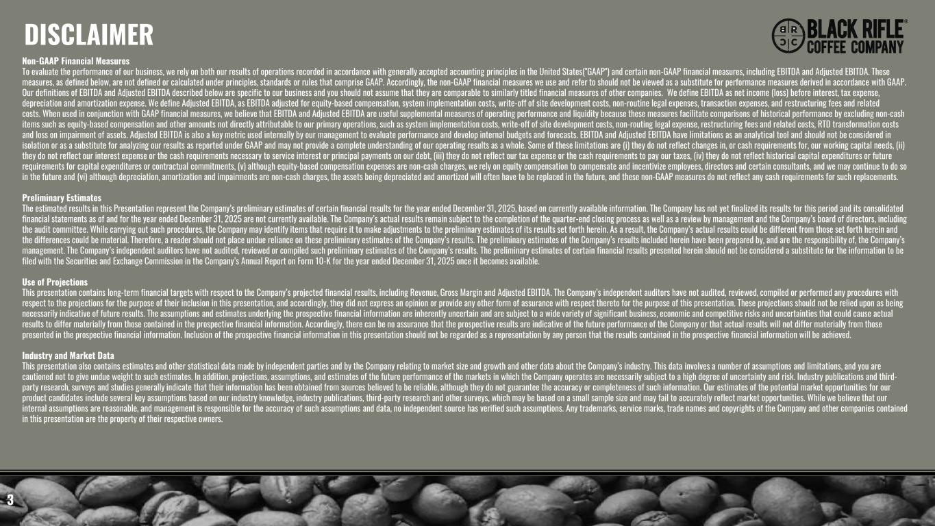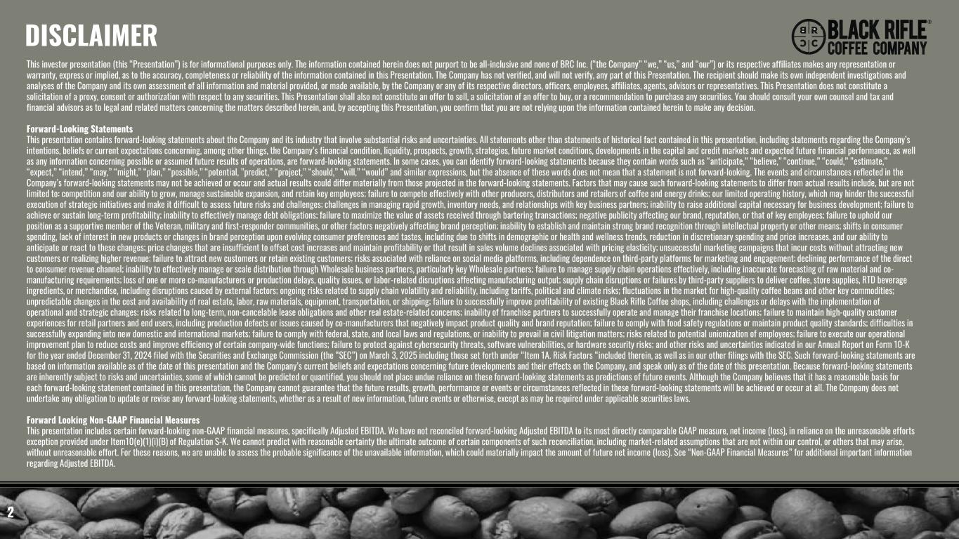 2 This investor presentation (this “Presentation”) is for informational purposes only. The information contained herein does not purport to be all-inclusive and none of BRC Inc. (“the Company” “we,” “us,” and “our”) or its respective affiliates makes any representation or warranty, express or implied, as to the accuracy, completeness or reliability of the information contained in this Presentation. The Company has not verified, and will not verify, any part of this Presentation. The recipient should make its own independent investigations and analyses of the Company and its own assessment of all information and material provided, or made available, by the Company or any of its respective directors, officers, employees, affiliates, agents, advisors or representatives. This Presentation does not constitute a solicitation of a proxy, consent or authorization with respect to any securities. This Presentation shall also not constitute an offer to sell, a solicitation of an offer to buy, or a recommendation to purchase any securities. You should consult your own counsel and tax and financial advisors as to legal and related matters concerning the matters described herein, and, by accepting this Presentation, you confirm that you are not relying upon the information contained herein to make any decision. Forward-Looking Statements This presentation contains forward-looking statements about the Company and its industry that involve substantial risks and uncertainties. All statements other than statements of historical fact contained in this presentation, including statements regarding the Company’s intentions, beliefs or current expectations concerning, among other things, the Company’s financial condition, liquidity, prospects, growth, strategies, future market conditions, developments in the capital and credit markets and expected future financial performance, as well as any information concerning possible or assumed future results of operations, are forward-looking statements. In some cases, you can identify forward-looking statements because they contain words such as “anticipate,” “believe,” “continue,” “could,” “estimate,” “expect,” “intend,” “may,” “might,” “plan,” “possible,” “potential, ”predict,” “project,” “should,” “will,” “would” and similar expressions, but the absence of these words does not mean that a statement is not forward-looking. The events and circumstances reflected in the Company’s forward-looking statements may not be achieved or occur and actual results could differ materially from those projected in the forward-looking statements. Factors that may cause such forward-looking statements to differ from actual results include, but are not limited to: competition and our ability to grow, manage sustainable expansion, and retain key employees; failure to compete effectively with other producers, distributors and retailers of coffee and energy drinks; our limited operating history, which may hinder the successful execution of strategic initiatives and make it difficult to assess future risks and challenges; challenges in managing rapid growth, inventory needs, and relationships with key business partners; inability to raise additional capital necessary for business development; failure to achieve or sustain long-term profitability; inability to effectively manage debt obligations; failure to maximize the value of assets received through bartering transactions; negative publicity affecting our brand, reputation, or that of key employees; failure to uphold our position as a supportive member of the Veteran, military and first-responder communities, or other factors negatively affecting brand perception; inability to establish and maintain strong brand recognition through intellectual property or other means; shifts in consumer spending, lack of interest in new products or changes in brand perception upon evolving consumer preferences and tastes, including due to shifts in demographic or health and wellness trends, reduction in discretionary spending and price increases, and our ability to anticipate or react to these changes; price changes that are insufficient to offset cost increases and maintain profitability or that result in sales volume declines associated with pricing elasticity; unsuccessful marketing campaigns that incur costs without attracting new customers or realizing higher revenue; failure to attract new customers or retain existing customers; risks associated with reliance on social media platforms, including dependence on third-party platforms for marketing and engagement; declining performance of the direct to consumer revenue channel; inability to effectively manage or scale distribution through Wholesale business partners, particularly key Wholesale partners; failure to manage supply chain operations effectively, including inaccurate forecasting of raw material and co- manufacturing requirements; loss of one or more co-manufacturers or production delays, quality issues, or labor-related disruptions affecting manufacturing output; supply chain disruptions or failures by third-party suppliers to deliver coffee, store supplies, RTD beverage ingredients, or merchandise, including disruptions caused by external factors; ongoing risks related to supply chain volatility and reliability, including tariffs, political and climate risks; fluctuations in the market for high-quality coffee beans and other key commodities; unpredictable changes in the cost and availability of real estate, labor, raw materials, equipment, transportation, or shipping; failure to successfully improve profitability of existing Black Rifle Coffee shops, including challenges or delays with the implementation of operational and strategic changes; risks related to long-term, non-cancelable lease obligations and other real estate-related concerns; inability of franchise partners to successfully operate and