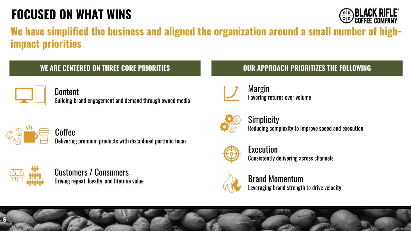 5 Brand-First, Mission-Driven Company with a Deeply Engaged Customer Base Category-Disruptive Coffee Brand with a Disciplined, Return-Focused Strategy Authentic, Veteran-Founded Brand with Credibility That Cannot Be Replicated Experienced Management Team Aligned Around Content, Coffee, and Customers Disciplined Operations and Capital Allocation Designed for Simplicity and Execution WHAT SETS US APART Intentional Focus on Fewer, Higher-Return Priorities