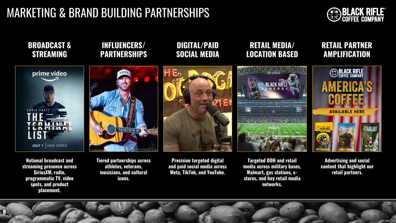 7 UNCONVENTIONAL BRAND, DEEP LOYALTY BRCC has taken a creative approach to building a leading lifestyle brand – embodying patriotism, tradition, freedom and actively championing those who serve OUR MISSION-DRIVEN APPROACH RESONATES DEEPLY WITH BLACK RIFLE LOYALISTS 1. Represents social media followers (mm) across Instagram, X, Facebook, YouTube and TikTok as of December 2025 Social Media Followers1, mm 8.8 8.7 6.0 4.6 3.3 1.5 1.4 0.9 0.8 0.4 0.3