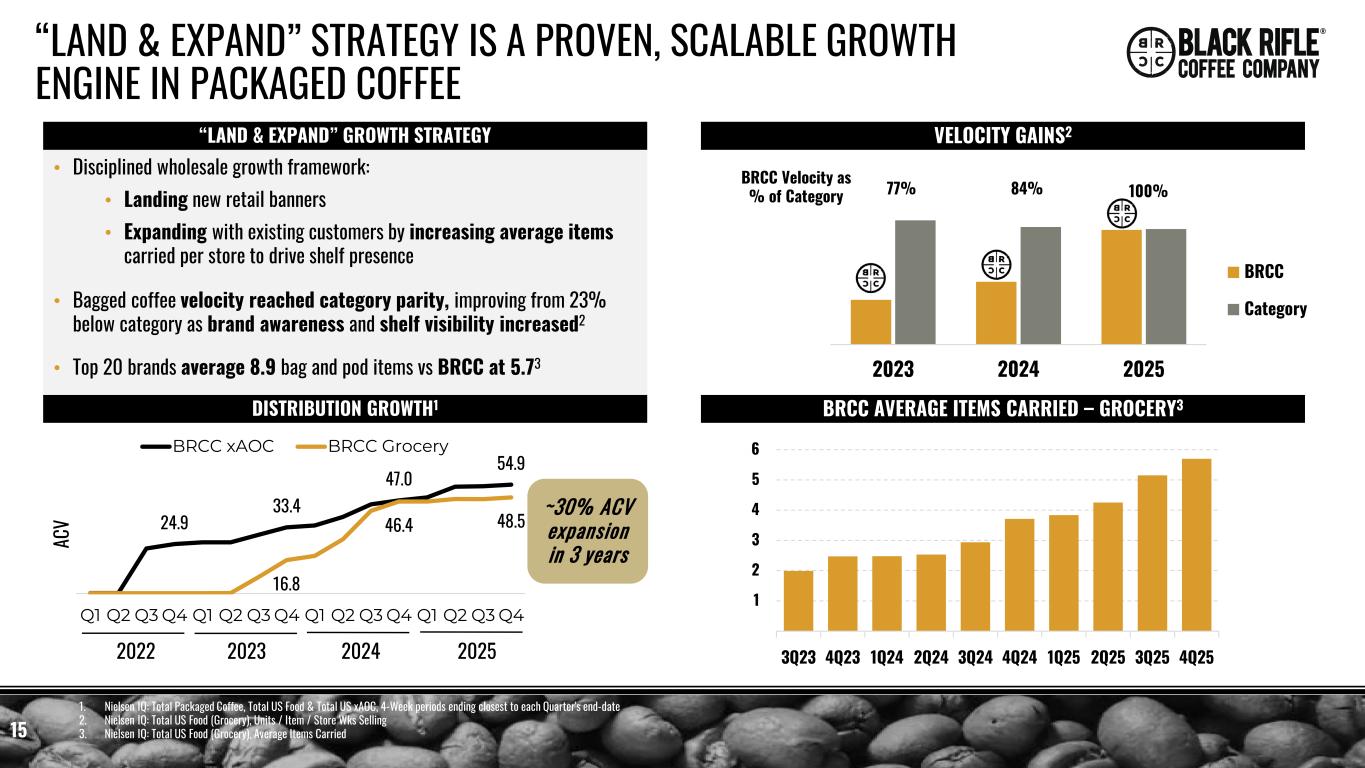 33.4% 29.8% 17.1% 5.5% 5.0% 3.4% 2.5% 0.5% 0.1% (2.0)% (2.1)% 14 UNIT DRIVEN GROWTH REFLECTS REAL CONSUMER DEMAND BRCC’s branding and focus on quality products have driven outsized growth compared to legacy brands PACKAGED COFFEE RETAIL SALES1 507 Annual Retail Sales ($ million)1 200 643 772,107 1,895 245359 489879 504 BRCC Is One of the Few Brands Growing Units While Others Rely on Price Unit Growth3 11.5% 22.1% (1.8)% (15.3)% (3.0)% (2.9)% (4.4)% (6.5)% (0.1)% (9.2)% 11.6% Pricing Growth4 19.7% 6.3% 19.2% 24.5% 8.2% 6.5% 7.2% 7.5% 0.1% 7.9% 10.7% Retail Sales Growth2 1. Nielsen IQ, Total US xAOC, Dollar Sales, Total Packaged Coffee Sales, L52 through 12/27/2025 2. Nielsen IQ, Total US xAOC, % Change in Dollar Sales, Total Packaged Coffee Sales, YTD through 12/27/2025 3. Nielsen IQ, Total US xAOC, EQ % Change, Total Packaged Coffee Sales, YTD through 12/27/2025 4. Nielsen IQ, Total US xAOC, Average EQ % Price Change, Total Packaged Coffee Sales, YTD through 12/27/2025