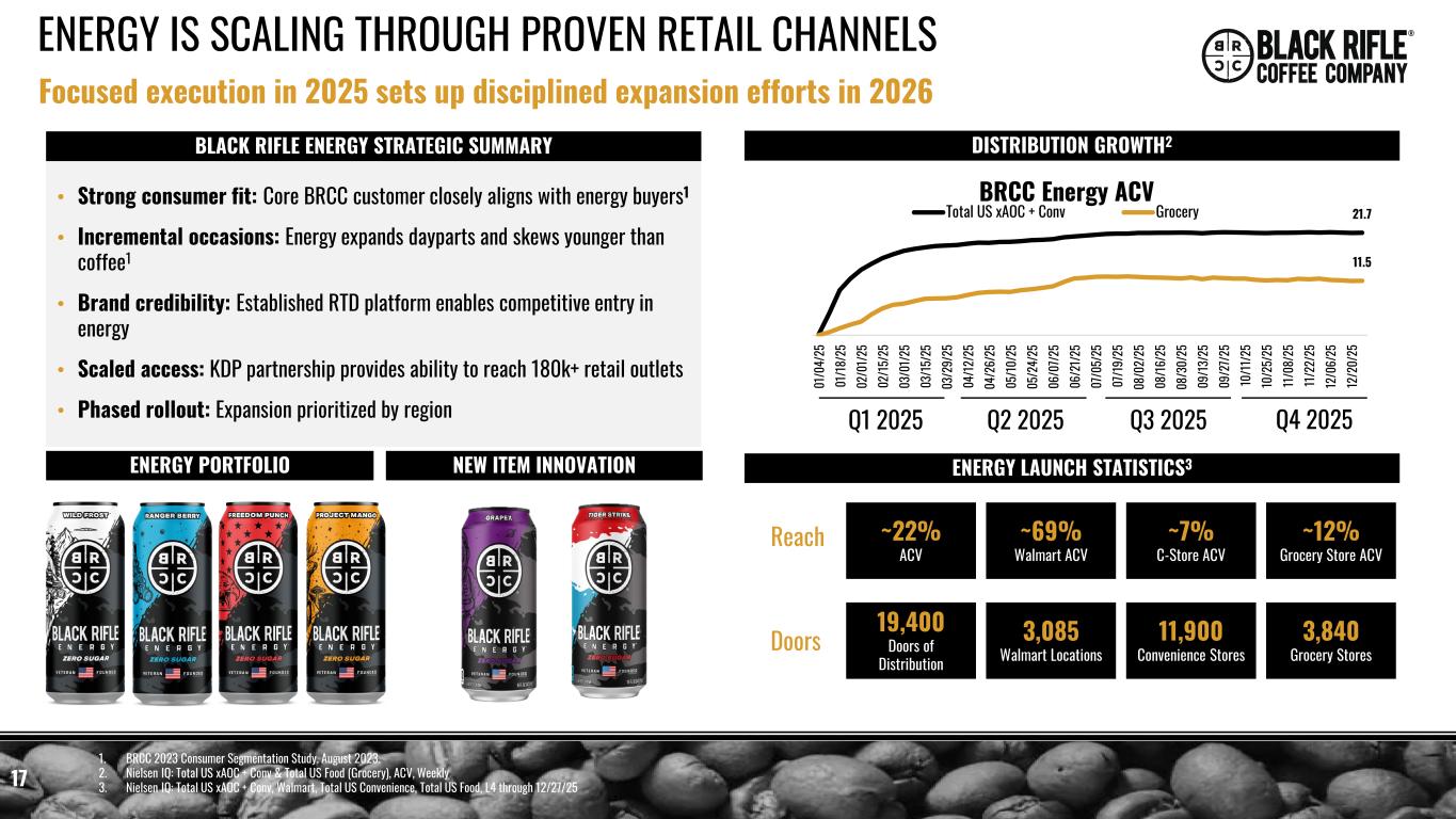 17 ENERGY IS SCALING THROUGH PROVEN RETAIL CHANNELS Focused execution in 2025 sets up disciplined expansion efforts in 2026 ENERGY PORTFOLIO NEW ITEM INNOVATION ~22% ACV 19,400 Doors of Distribution 3,085 Walmart Locations ~69% Walmart ACV 11,900 Convenience Stores ~7% C-Store ACV 3,840 Grocery Stores ~12% Grocery Store ACV ENERGY LAUNCH STATISTICS3 21.7 11.5 01 /0 4/ 25 01 /18 /2 5 02 /0 1/2 5 02 /15 /2 5 03 /0 1/2 5 03 /15 /2 5 03 /2 9/ 25 04 /12 /2 5 04 /2 6/ 25 05 /10 /2 5 05 /2 4/ 25 06 /0 7/2 5 06 /2 1/2 5 07 /0 5/ 25 07 /19 /2 5 08 /0 2/ 25 08 /16 /2 5 08 /3 0/ 25 09 /13 /2 5 09 /2 7/2 5 10 /11 /2 5 10 /2 5/ 25 11/ 08 /2 5 11/ 22 /2 5 12 /0 6/ 25 12 /2 0/ 25 AC V % BRCC Energy ACV Total US xAOC + Conv Grocery Q3 2025Q1 2025 Q2 2025 BLACK RIFLE ENERGY STRATEGIC SUMMARY • Strong consumer fit: Core BRCC customer closely aligns with energy buyers1 • Incremental occasions: Energy expands dayparts and skews younger than coffee1 • Brand credibility: Established RTD platform enables competitive entry in energy • Scaled access: KDP partnership provides ability to reach 180k+ retail outlets • Phased rollout: Expansion prioritized by region DISTRIBUTION GROWTH2 1. BRCC 2023 Consumer Segmentation Study. August 2023. 2. Nielsen IQ: Total US xAOC + Conv & Total US Food (Grocery), ACV, Weekly 3. Nielsen IQ: Total US xAOC + Conv, Walmart, Total US Convenience, Total US Food, L4 through 12/27/25 Q4 2025 Reach Doors