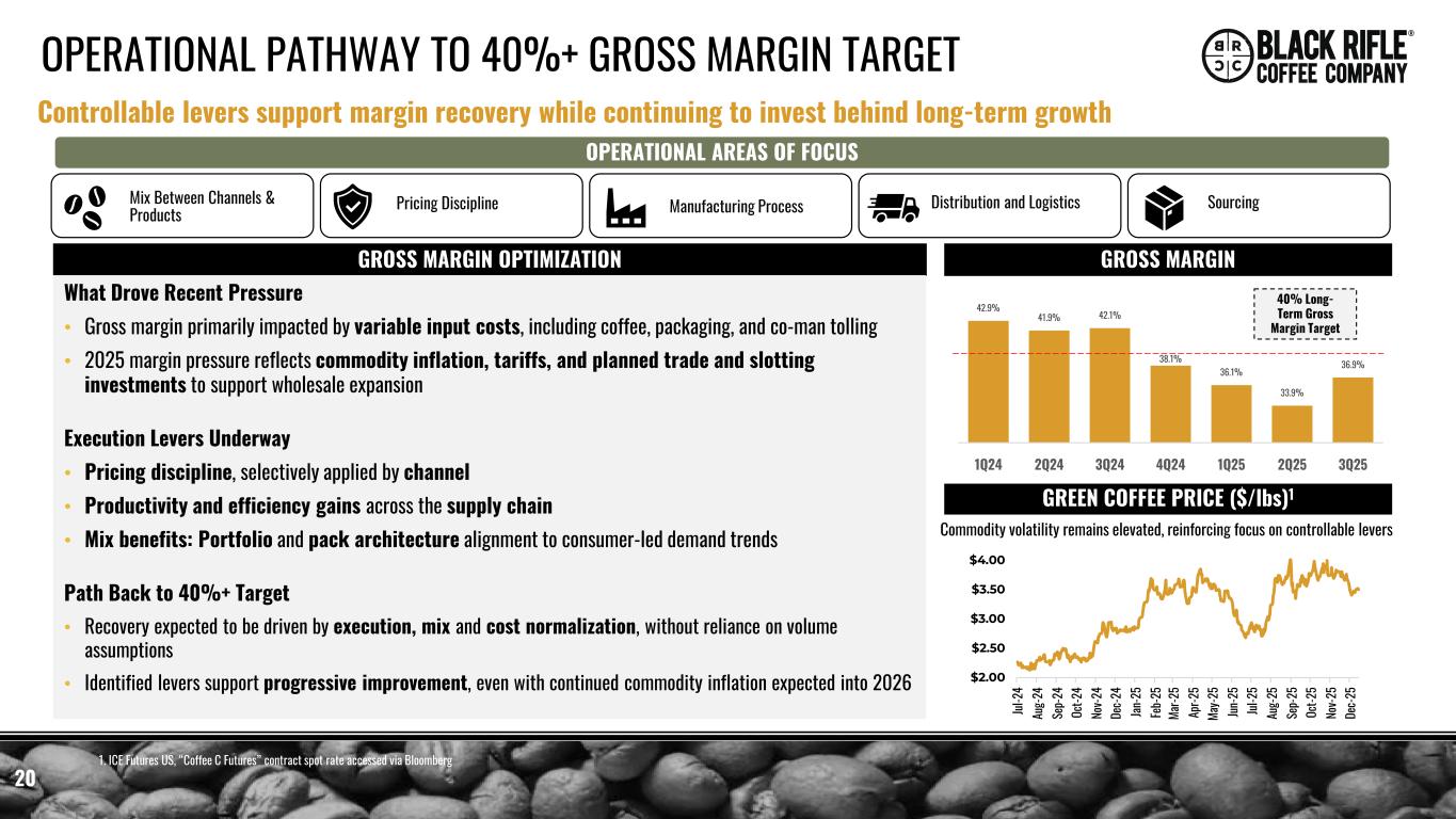 OPERATIONAL PATHWAY TO 40%+ GROSS MARGIN TARGET OPERATIONAL AREAS OF FOCUS Manufacturing ProcessMix Between Channels & Products Distribution and Logistics Sourcing 20 GROSS MARGIN OPTIMIZATION GROSS MARGIN Controllable levers support margin recovery while continuing to invest behind long-term growth What Drove Recent Pressure • Gross margin primarily impacted by variable input costs, including coffee, packaging, and co-man tolling • 2025 margin pressure reflects commodity inflation, tariffs, and planned trade and slotting investments to support wholesale expansion Execution Levers Underway • Pricing discipline, selectively applied by channel • Productivity and efficiency gains across the supply chain • Mix benefits: Portfolio and pack architecture alignment to consumer-led demand trends Path Back to 40%+ Target • Recovery expected to be driven by execution, mix and cost normalization, without reliance on volume assumptions • Identified levers support progressive improvement, even with continued commodity inflation expected into 2026 GREEN COFFEE PRICE ($/lbs)1 1. ICE Futures US, “Coffee C Futures” contract spot rate accessed via Bloomberg Commodity volatility remains elevated, reinforcing focus on controllable levers $2.00 $2.50 $3.00 $3.50 $4.00 Jul -24 Au g-2 4 Se p-2 4 Oc t-2 4 No v-2 4 De c-2 4 Jan -25 Fe b-2 5 Ma r-2 5 Ap r-2 5 Ma y-2 5 Jun -25 Jul -25 Au g-2 5 Se p-2 5 Oc t-2 5 No v-2 5 De c-2 5 42.9% 41.9% 42.1% 38.1% 36.1% 33.9% 36.9% 1Q24 2Q24 3Q24 4Q24 1Q25 2Q25 3Q25 40% Long- Term Gross Margin Target Pricing Discipline